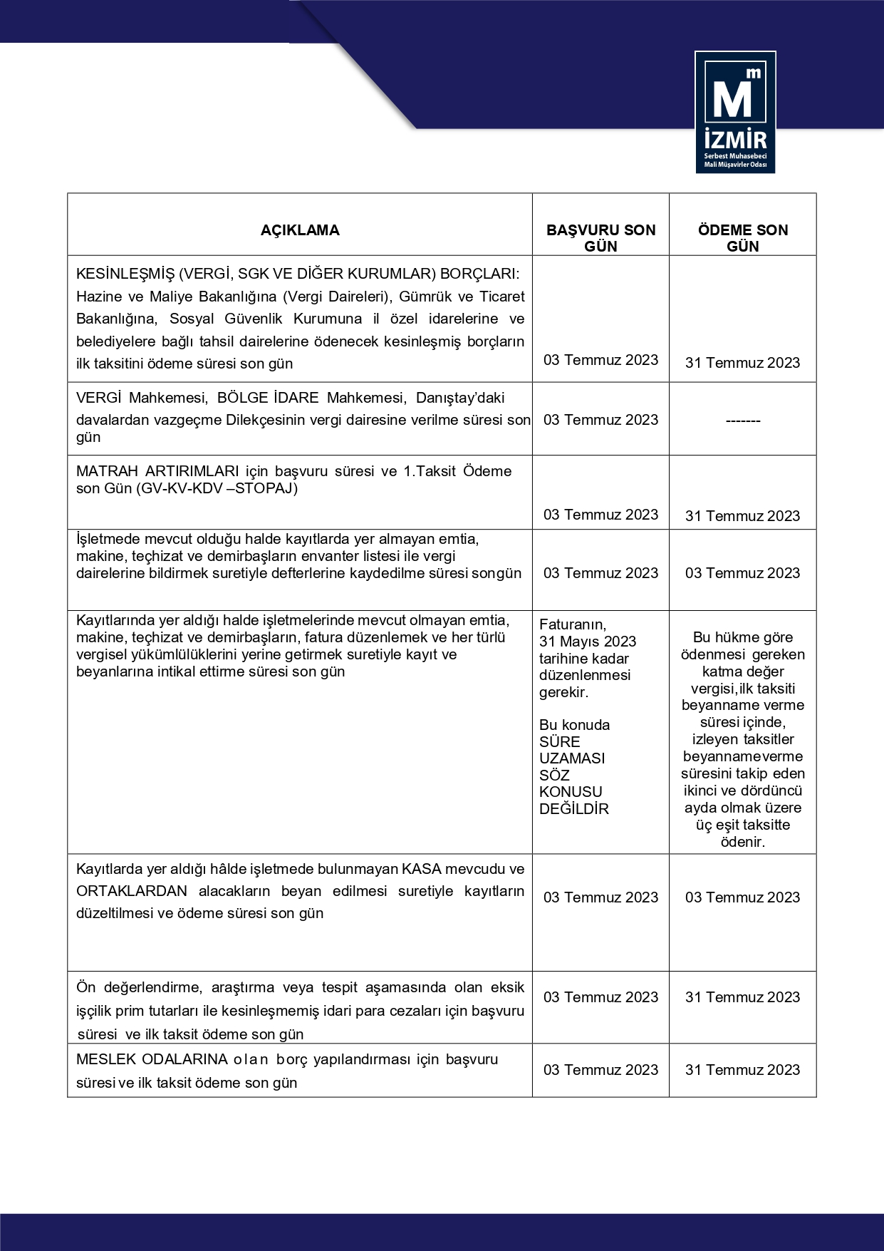Yapılan değişiklik ile 7440 sayılı Kanunun 2., 3., 4., 5., 6., 7. ve 8. Maddeleri ile 10. Maddesinin üçüncü, dördüncü, beşinci, sekizinci, dokuzuncu, on birinci, on ikinci, on üçüncü, on dördüncü, on beşinci, on altıncı, on yedinci, on sekizinci, on dokuzuncu ve yirminci fıkralarından yararlanmak için öngörülmüş başvuru bildirim ve beyan süreleri 30/6/2023 tarihine kadar, 30 Haziran 2023 Tarihi Kurban Bayramı tatiline rastladığı için süre, tatil sonrası ilk mesai günü olan 03.07.2023 tarihine, bu başvuru, bildirim ve beyana ilişkin ilk taksit ödeme süreleri ise 31/7/2023 tarihine kadar (bu tarih dahil) uzatılmıştır.