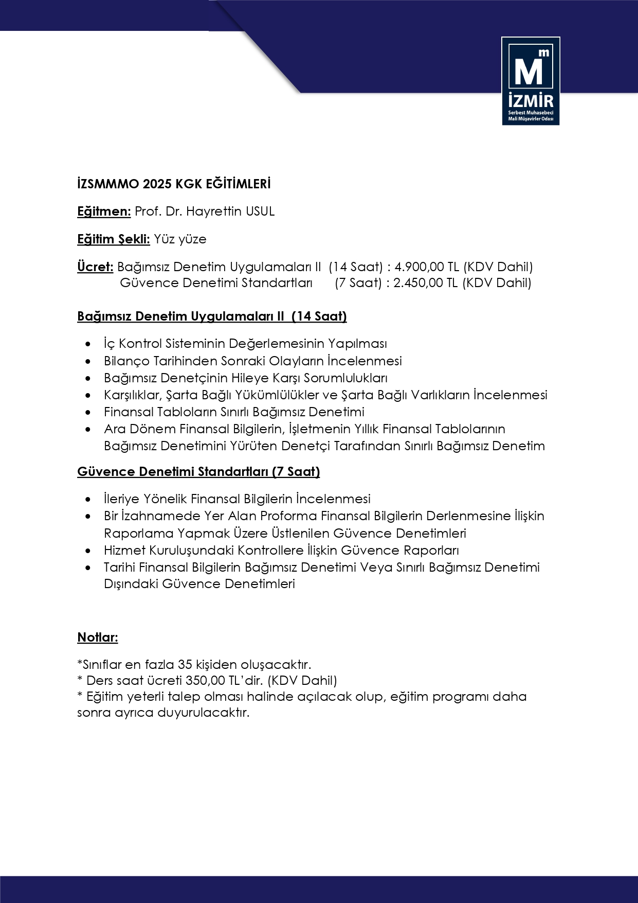 İZSMMMO 2025 KGK Eğitimleri Başlıyor!!! 14 Ekim 2025 Salı133 KGK Bağımsız Denetçi Eğitimi "Ön Başvuru" yapmak için lütfen tıklayınız.