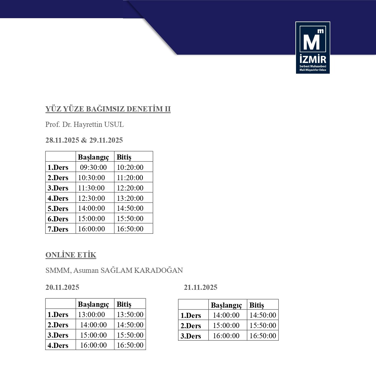 İZSMMMO KGK Bağımsız Denetçi Eğitimleri Başlıyor!!! 3 Kasım 2025 Pazartesi828 Yüz Yüze Bağımsız Denetim Uygulamaları II eğitimine kayıt için lütfen tıklayınız.Yüz Yüze Güvence Denetimi Standartları eğitimine kayıt için lütfen tıklayınız.Online Etik eğitimine kayıt için lütfen tıklayınız.