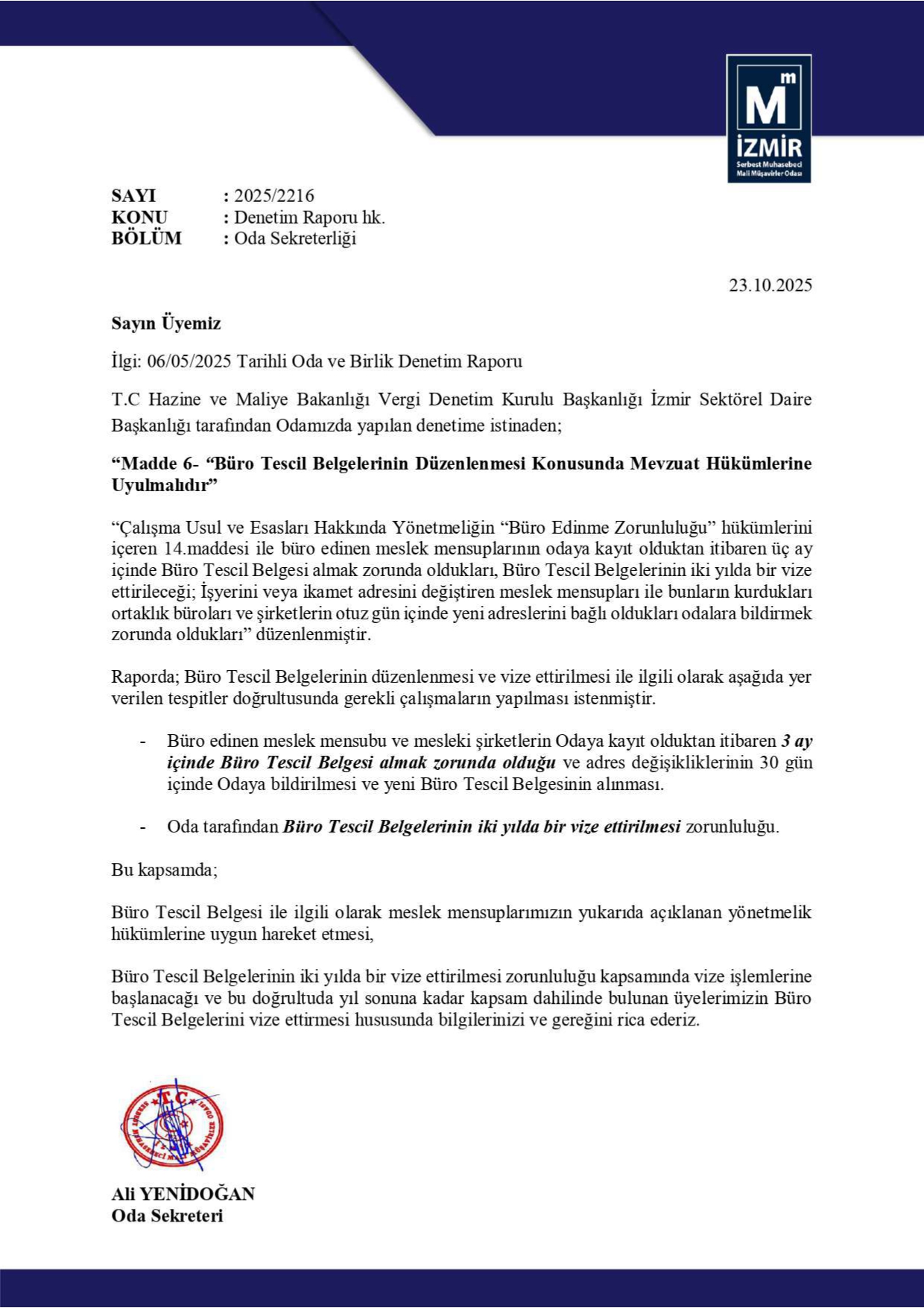 Büro Tescil Belgesi Alma ve Vize Ettirilmesi Zorunluluğu İle İlgili Yazımız 23 Ekim 2025 Perşembe1480