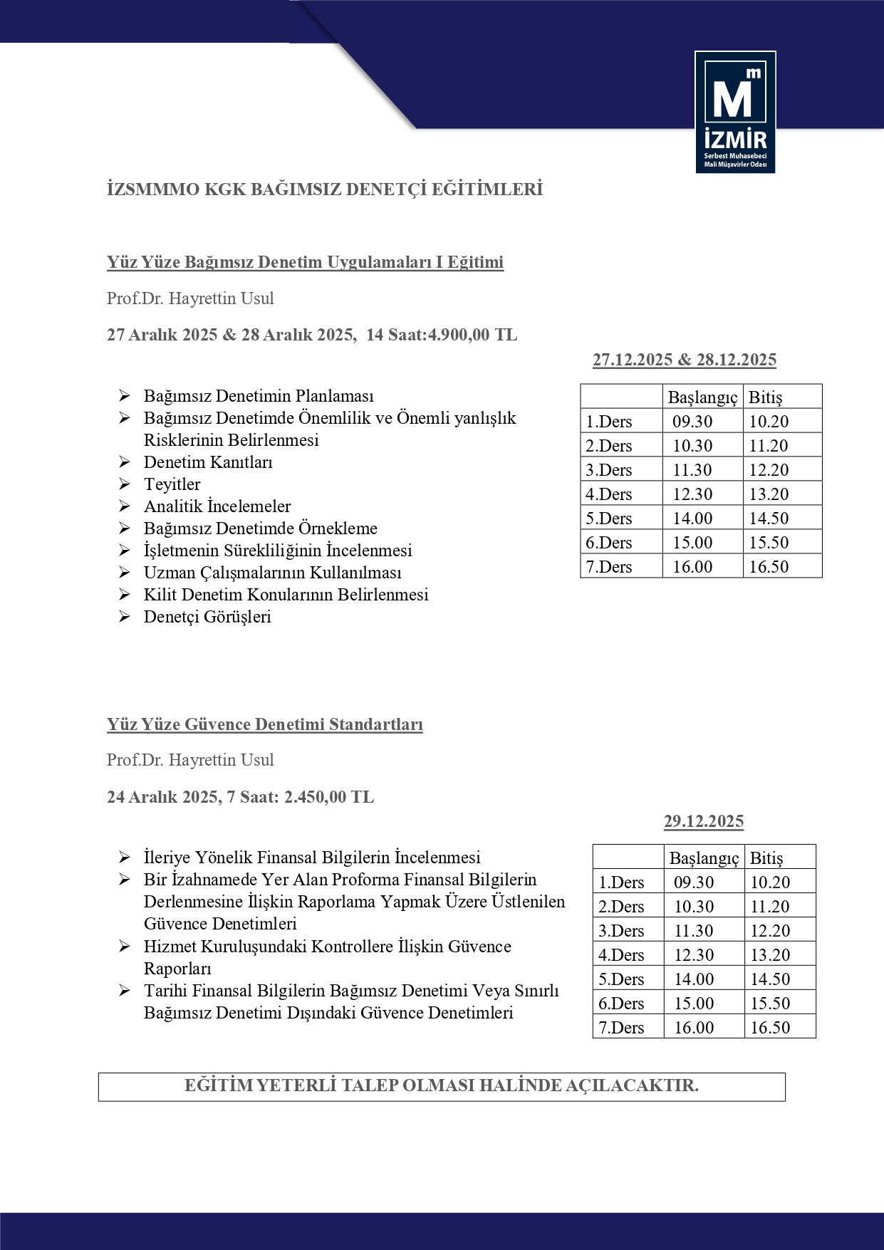 KGK Bağımsız Denetçi Eğitimi Aralık_2025 Eğitim Programı 19 Aralık 2025 Cuma682 "Yüz Yüze Bağımsız Denetim I" eğitimine kayıt için lütfen tıklayınız."Yüz Yüze Güvence Denetimi" eğitimine kayıt için lütfen tıklayınız.