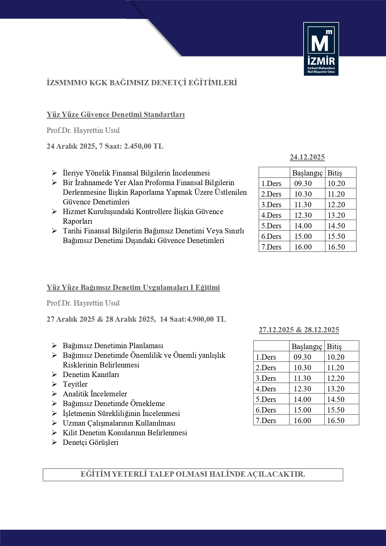 KGK Bağımsız Denetçi Eğitimi Aralık_2025 Eğitim Programı 19 Aralık 2025 Cuma226 ""Yüz Yüze Bağımsız Denetim I" eğitimine kayıt için lütfen tıklayınız."Yüz Yüze Güvence Denetimi" eğitimine kayıt için lütfen tıklayınız.