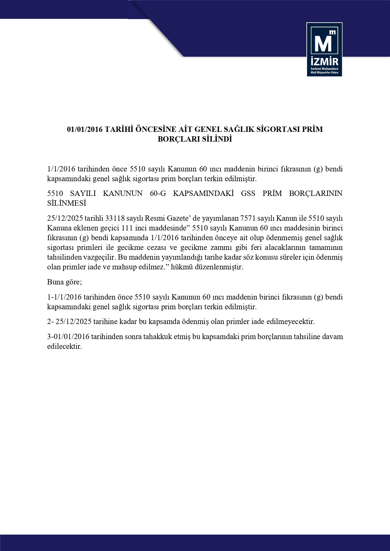 01/01/2016 Tarihi Öncesine Ait Genel Sağlık Sigortası Prim Borçları Silindi 31 Aralık 2025 Çarşamba60 7571 Türk Ceza Kanunu ile Bazı Kanunlarda ve 631 Sayılı Kanun Hükmünde Kararnamede Değişiklik Yapılmasına Dair Kanun
