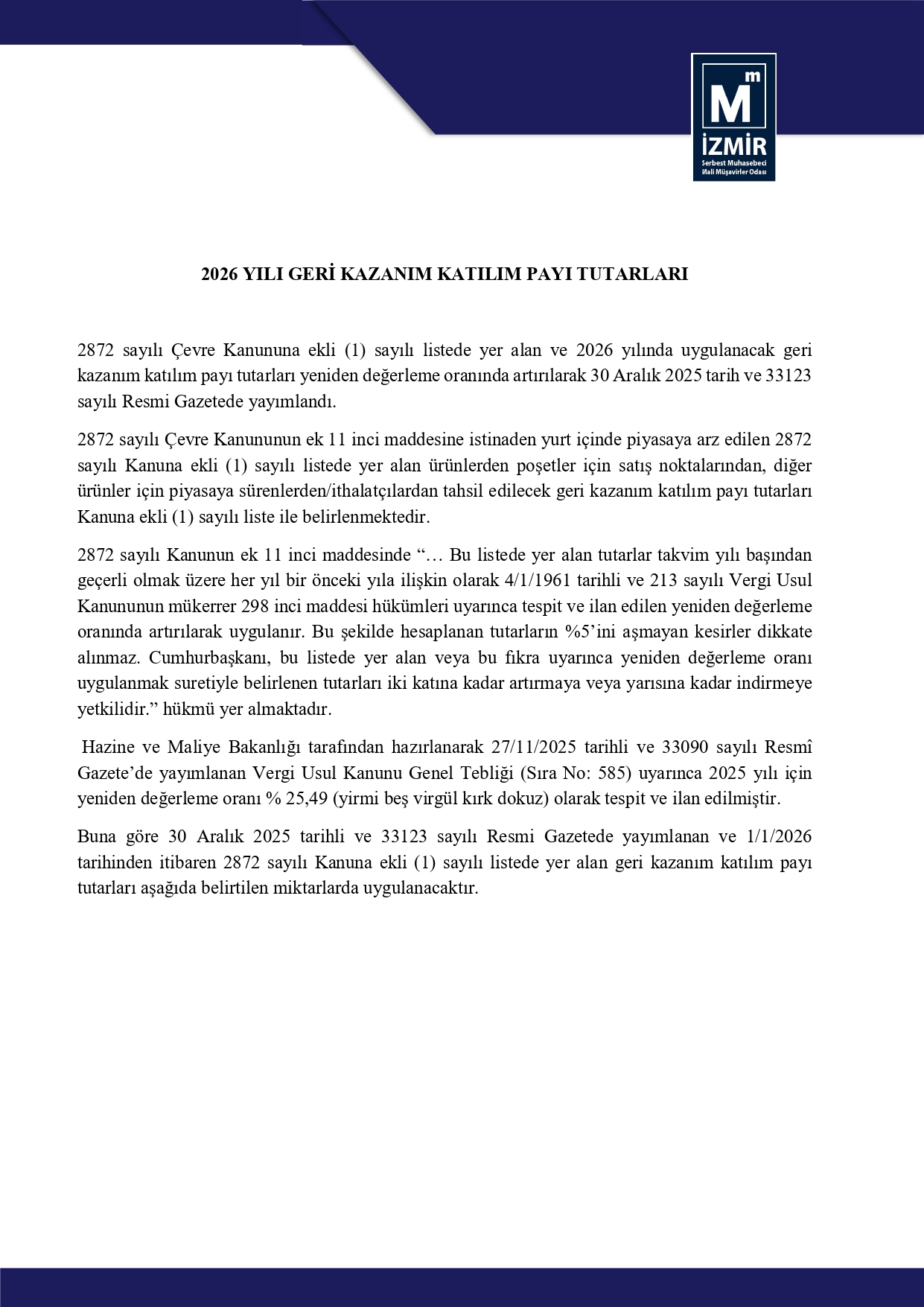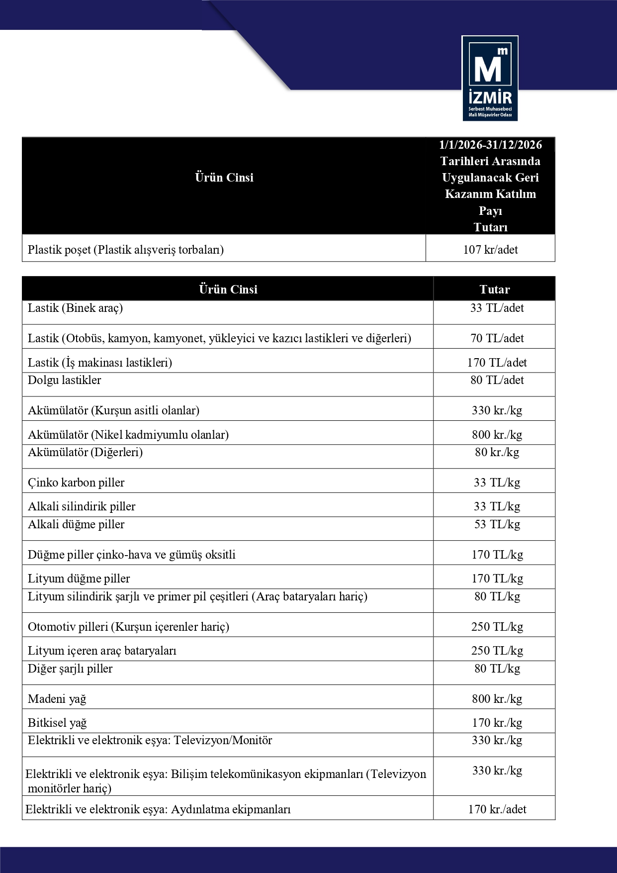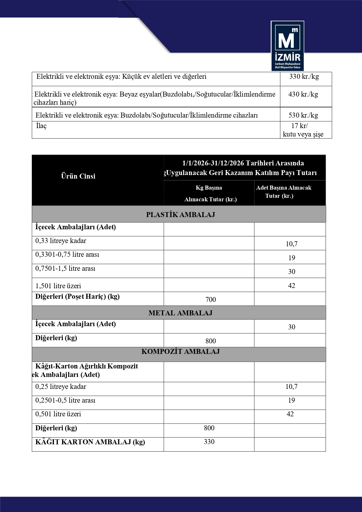 2026 Yılı Geri Kazanım Katılım Payı Tutarları