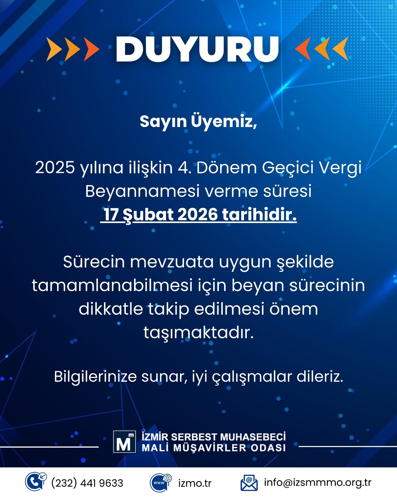 2025/4.Dönem Geçici Vergi Beyanname Verme Süresi Son Tarih:17.02.2026